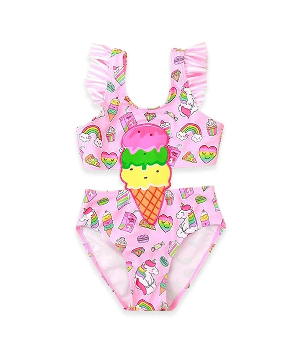 Con una tela ligera, y lindo diseño lleno de color, y su original diseño de 2 piezas unidos por un delicioso Helado ,  este traje de baño te mantendrá fresca y cómoda durante todo el día. Traje de Baño 100% Poliester Multicolor Características: Estampado de Helado, Arcoriris y Corazones